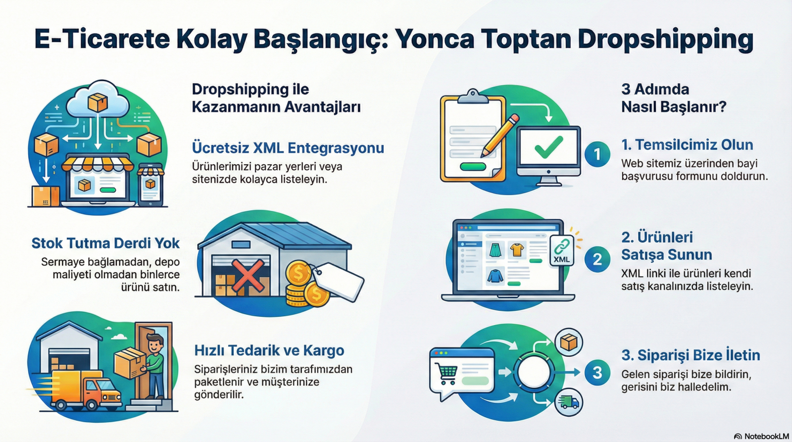 E-Ticarette Başarının Anahtarı: Ücretsiz XML ve 24 Saatte Kargo Avantajıyla Tanışın!E-ticaret dünyasında rekabet her geçen gün artarken, doğru tedarikçiyi bulmak ve operasyonel süreçleri yönetmek en büyük zorluklardan biri haline geldi. Yoncatoptan.com olarak, işinizi büyütmeniz veya sıfırdan bir e-ticaret imparatorluğu kurmanız için tüm engelleri ortadan kaldırıyoruz. Stok Tutma Derdine Son: 20.000+ Ürün Tek Tıkla Mağazanızda!Kendi deponuzu kurmak veya binlerce ürünü önceden satın almak zorunda değilsiniz. İç giyim, pijama ve çorap kategorilerinde yer alan 20.000’den fazla ürün çeşidimizi doğrudan mağazanıza entegre etmeniz için size ücretsiz XML desteği sunuyoruz. Üstelik bu hizmet için herhangi bir başlangıç ücreti veya gizli maliyet talep etmiyoruz. Hız Sizi Öne Geçirir: 1 Günde Kargo HizmetiMüşterileriniz için en önemli kriterlerden biri hızlı teslimattır. Biz de bu bilinçle, gelen siparişlerinizi 1 iş günü içerisinde hazırlayıp kargoya teslim ediyoruz. Güçlü lojistik altyapımız sayesinde operasyonel yükü biz üstleniyoruz, siz sadece satışlarınıza odaklanıyorsunuz.Neden Yonca Toptan Dropshipping?• Maliyet Sıfır: XML ve sevk işlemleri için ücret ödemezsiniz